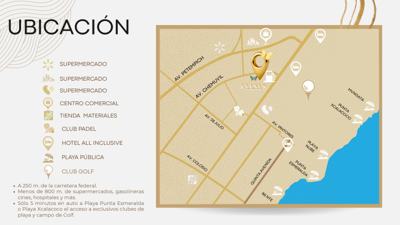 A 250 m de la carretera federal, a menos de 800 m de servicios esenciales y a solo 5 minutos de las mejores playas, beach clubs y campo de golf.